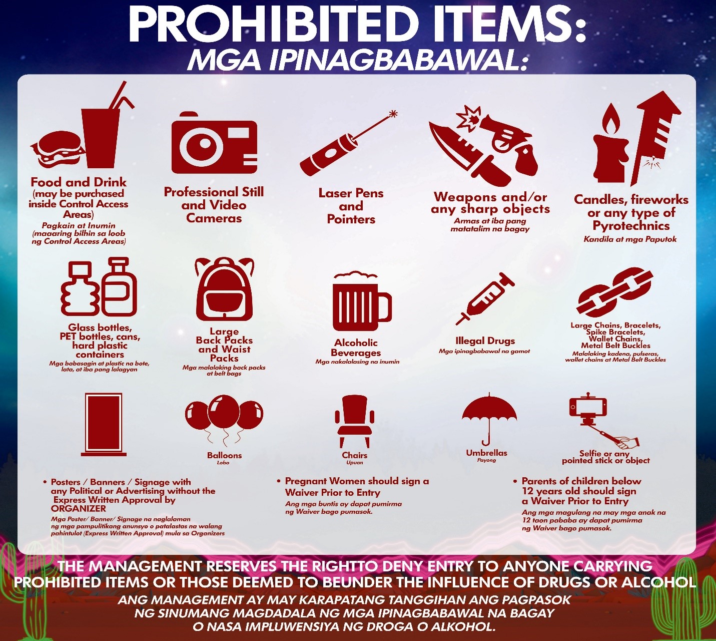 Large and visible signages at key areas like entrances inform concert goers the list of prohibited items inside the venue.