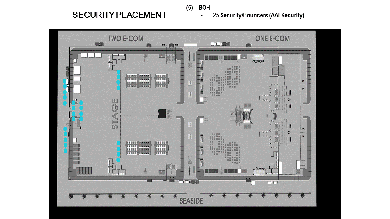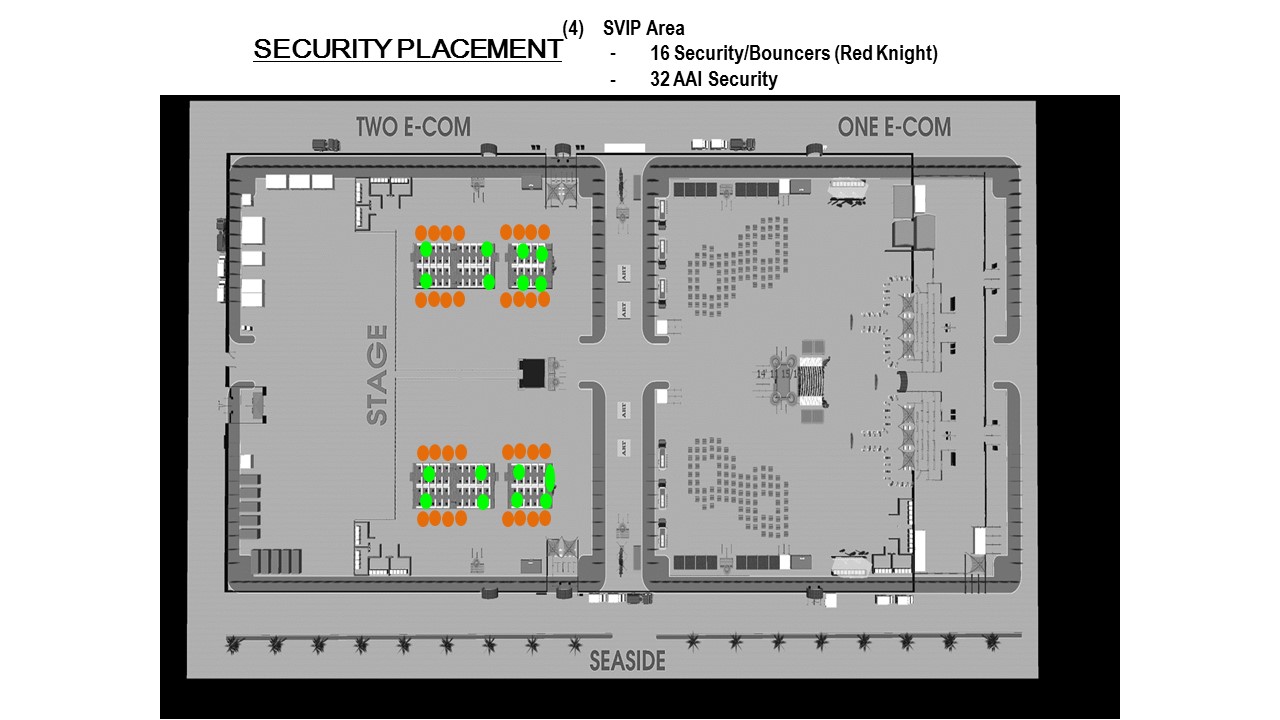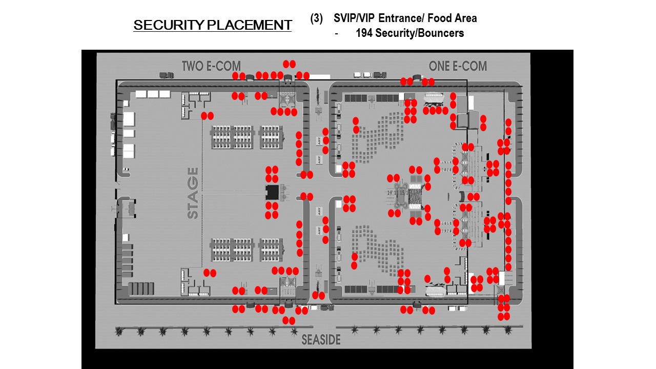 Security was to be provided by teams comprised of bouncers, on-ground personnel and the police. These units were to be deployed inside and outside the venue including critical locations like entrances and exits and other entry points between different sections of the venue.